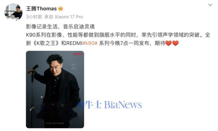 王腾表示,“K90系列在影像、性能等都做到旗舰水平的同时,率先引领声学领域的突破。全新《K歌之王》和REDMIk90系列今晚7点一同发布,期待。”