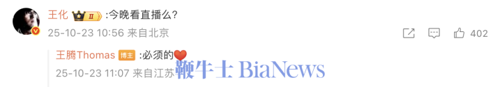 小米公关部总经理王化现身评论区,询问王腾今晚是否看直播,王腾回应称:“必须的”。